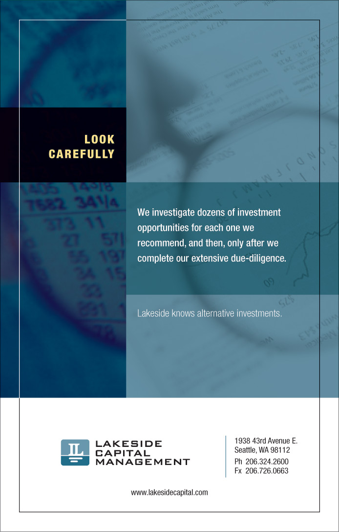 This young capital management firm needed a brand identity that reflected the conservative management philosophy of the principals. Since their offices were situated on Lake Washington, a placid water scene seemed a perfect metaphor. Along with the mark, branding included stationery, a custom presentation folder for client documents and a print ad campaign that emphasized the firm's unique investment philosophy.